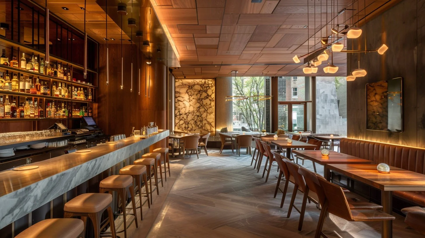 In this concept, the theme is wood paneling, marble countertop, leather banquettes, and 2700 Kelvin warm lighting to create a warm inviting yet sophIsticated ambience.