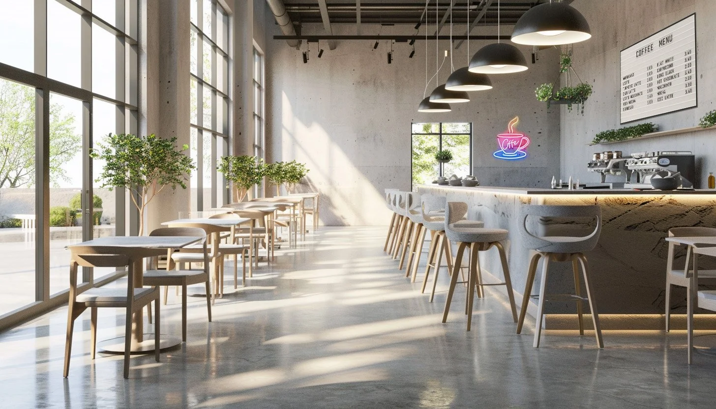 In this coffee shop interior design concept, the interplay between concrete paneling for the counter top, concrete flooring, warm wood, and soft upholstery creates a balanced space where each material complements the others without dominating the design.