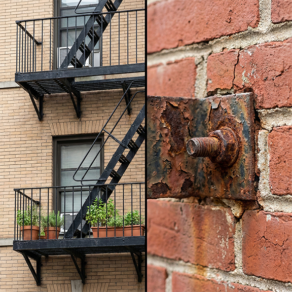 The challenge with aging iron is specific. Rust does not just sit on the surface. Once it gets into a joint or around a bolt, it expands, a process called rust jacking, which can crack or snap heavy iron components from the inside. Paint applied over existing rust traps moisture and accelerates decay. A fire escape that looks fine from the street can be structurally compromised at its anchor points in ways only a close inspection will catch.